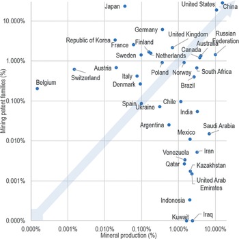 Note: Sample contains only top mineral-producing and top mining-patenting countries. Axes are expressed in logarithmic scale.