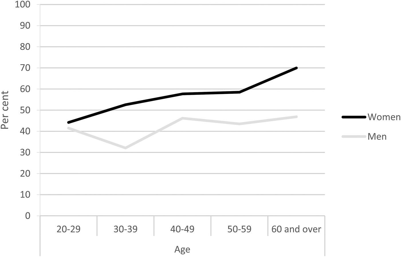 Figure 3 shows that a significant proportion of men and women in Dakar also said they were worried about how their appearance would change as they grow older (i.e. ‘fully agreed’ or ‘rather agreed’ with the sentence ‘I worry about how my physical appearance will change as I grow older’). On the whole, women (51.4%) were more worried about aesthetic body changes than men (40.3%; χ2(1 degree of freedom) = 12,31; p < 0.001). This rate increased gradually among women, starting at 44 per cent among the younger and reaching 70 per cent among older women (χ2(4) = 10.61; p < 0.05). The curve was more uneven among men. The proportion of men who said they worried about how their looks will change with age did not vary significantly through the lifecourse (χ2(4) = 5.71; not significant (NS)).