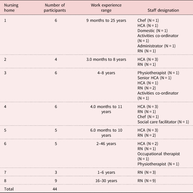 Ethical approval was granted by the Research Ethics Committee of Ulster University. Letters of Invitation were sent to all Directors of Nursing for private, voluntary, individually owned and group-owned nursing homes registered in Ireland with Nursing Homes Ireland. From this dataset, a randomly selected group of homes was chosen for inclusion in data collection (N = 11). As there is evidence to suggest that the experience of moving to a care home may be different across geographical locations (Ryan et al., Reference Ryan, McKenna and Slevin2012), the sample selection reflected a mix of urban and rural nursing homes. The eligibility criteria stipulated that participants must be able and willing to provide informed consent and agree to the recording of the focus group interviews. Eight Directors of Nursing agreed to participate and subsequently invited all residents and staff in their nursing homes to take part in the focus group interviews. Three nursing homes declined the invitation to participate. Participant Information Leaflets, issued to all participants, clarified the voluntary nature of participation and the procedure for recording and transcribing the interview data. Consent forms were signed by all participants prior to the commencement of the interviews.