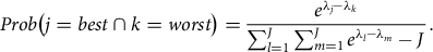 where εij is the random error term. The probability that the respondent i chooses attribute j as the most important attribute and attribute k as least important is the probability that the difference between I ij and I ik is greater than all differences available from the available choices. Assuming the error term is independently and identically distributed Type I extreme value, the probability of choosing a given most/least important combination takes the multinomial logit form (Lusk and Briggeman Reference Lusk and Briggeman2009), represented by: