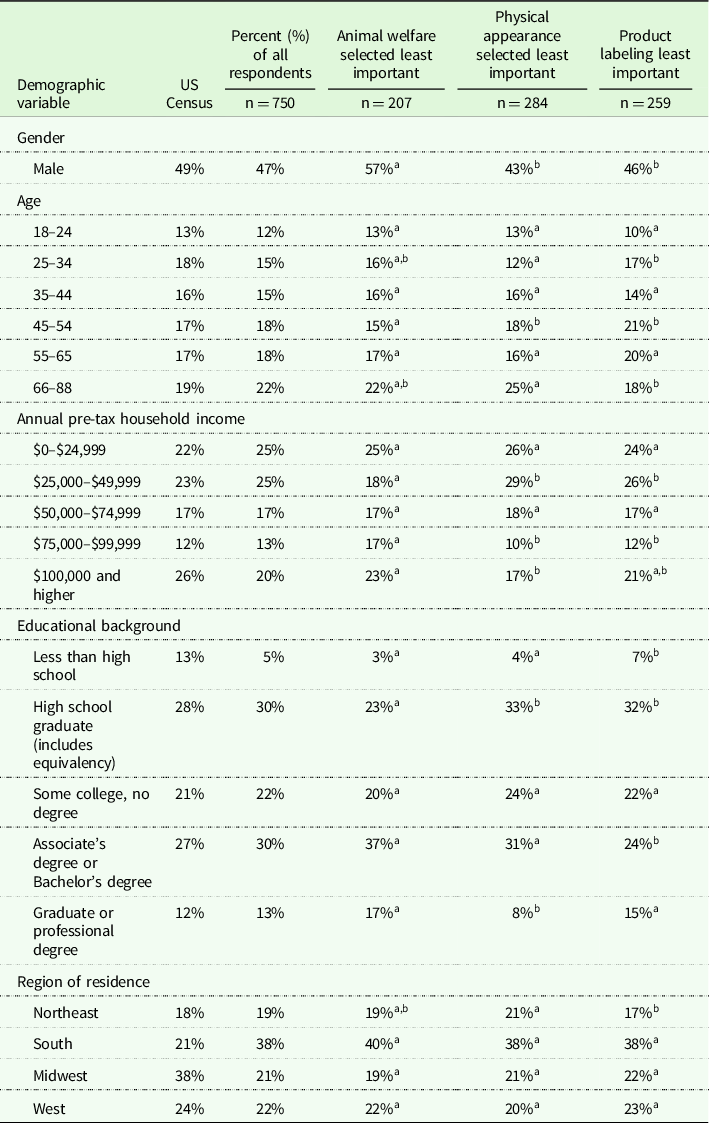 Matching letters indicate that demographic is not statistically different between the three self-selected categories animal welfare, product labeling, and physical appearance selected as least important. For example, the percentage of males is statistically different between animal welfare and product labeling and animal welfare and physical appearance, but is not statistically different between product labeling and physical appearance.