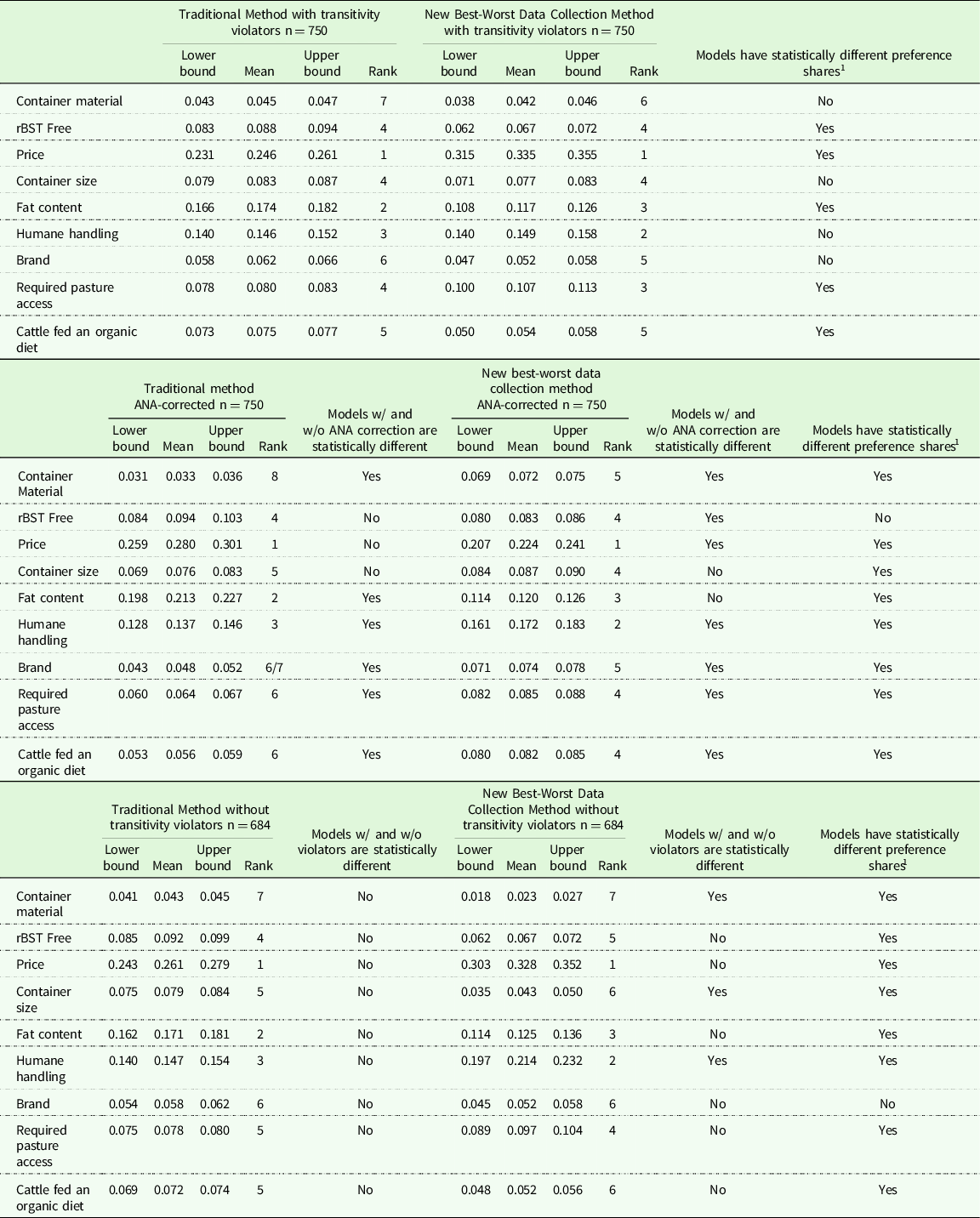 Table 3. Confidence intervals of preference shares for traditional method and new best-worst data collection method given in column. The first grouping is the original model, second grouping is ANA-corrected, and third grouping is estimated without transitivity violators. Statistical difference indicated by yes/no