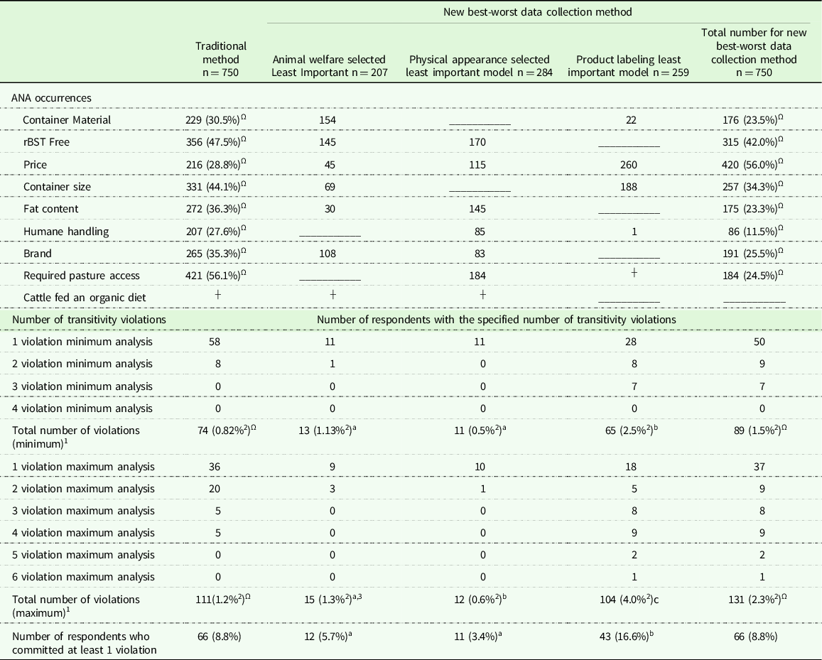 Table 4 indicates the number and percentage of both ANA occurrences and transitivity violations. The first section of the table indicates the number of ANA occurrences that occurred for each attribute. For example, the second column indicates the number of ANA occurrences that occurred for each attribute for the traditional method. The percentage of respondents who had an ANA occurrence was also calculated. So for example, for the traditional method 229 respondents (30.5%) had an ANA occurrence for container material. The next 3 columns in this section of the table indicate the number of respondents who had an ANA occurrence for the component models that make up the new best-worst scaling method. The final column indicates the total number of ANA occurrences (a summation of the component models), and the percentage of respondents for the new best-worst data collection method. The percentage of respondents with ANA occurrences were statistically compared between the traditional and new method and indicated in the table.