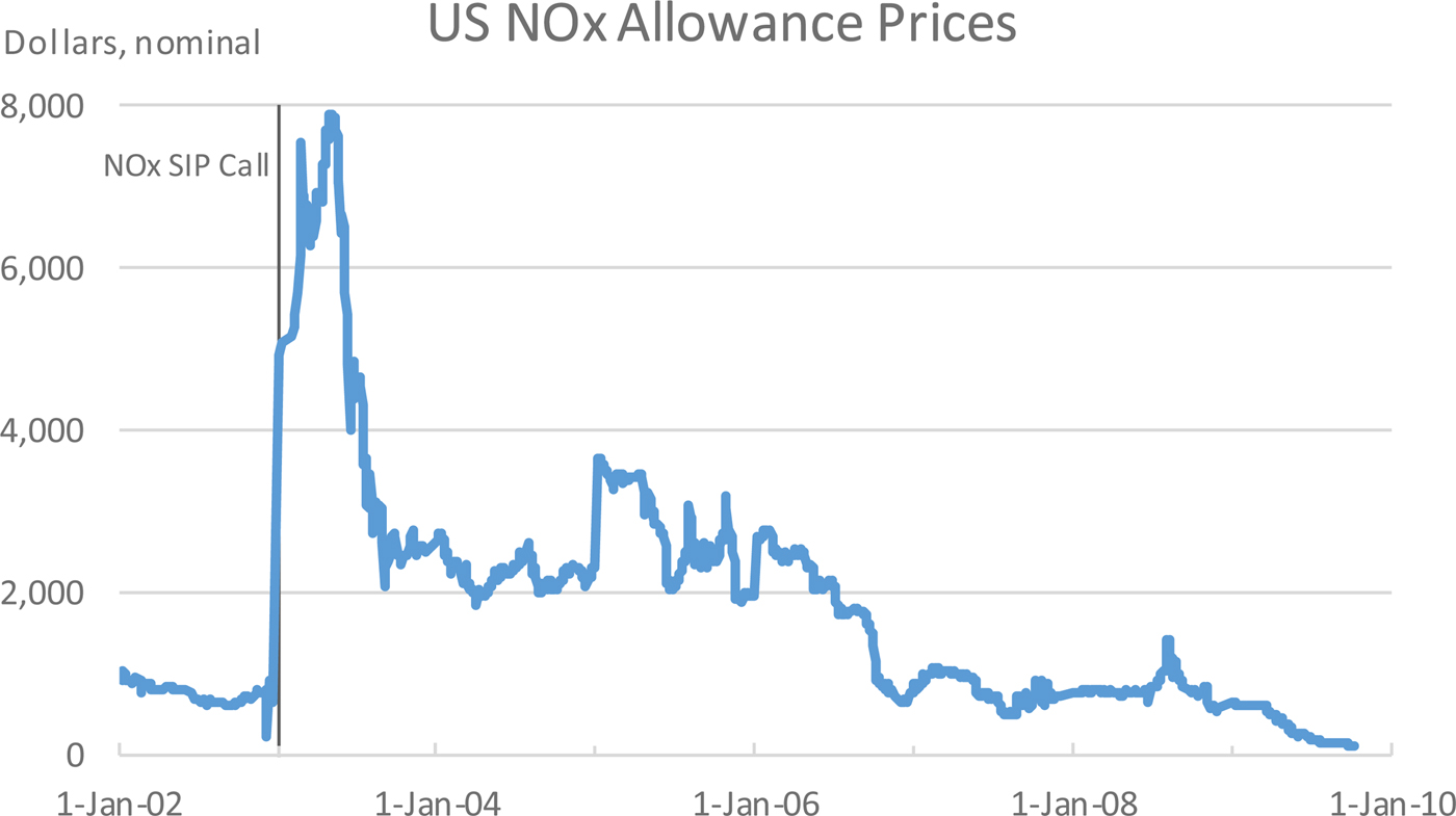 The second important trading program regulated emissions of nitrogen oxides from the power sector in 19 states in the eastern United States. Nitrogen oxides (NOx) are a precursor to ozone formation, a summer season problem, and contribute to the formation of fine particulates and acidification on a year-round basis. This program was applied during the five-month ozone season and was the outgrowth of a previous program involving only northeastern states. It was precipitated by the US Environmental Protection Agency's call for states to revise their state implementation plans, as shown in Figure 2. The late entry of Maryland to the trading program and a dramatic increase in natural gas prices caused a short-term price spike at the outset of the program, but prices soon fell to a fairly stable level with the widespread adoption of selective catalytic reduction, and boiler-level adjustments in facility operations (Burtraw and Szambelan Reference Burtraw and Szambelan2009). The advent of the CAIR program for nitrogen oxides drove further investments in emissions reductions and further depressed allowance prices.