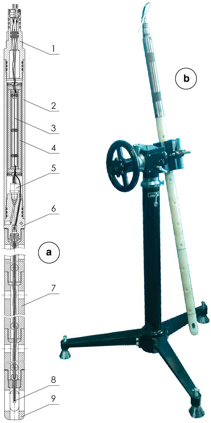 Fig. 1. Module A (temperature-pressure logger): (a) general schematic: (1) adapter-tip with electric contacts; (2) high-pressure chamber; (3) electronic components; (4) insulation material; (5) pressure sensor; (6) coupling adapter; (7) low thermal conductivity housing (extension tube from Caprolon®); (8) thermometer; (9) guide head; (b) general view of the logger.