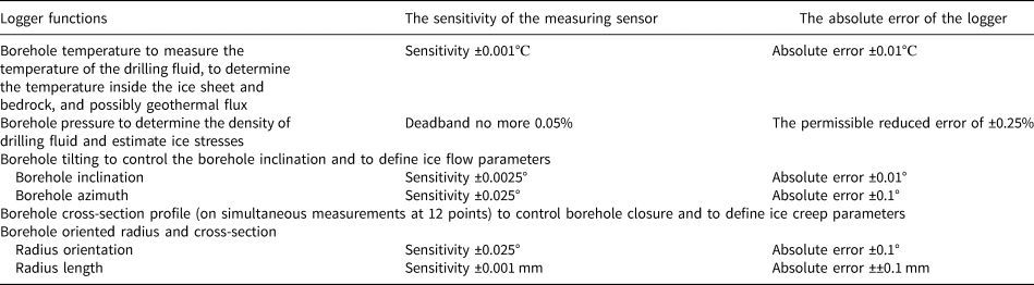 The accuracy and especially sensitivity of measurement systems based on the applied construction solutions allow, besides the fulfillment of the technical objectives of monitoring the condition of the borehole, to also attain the required highly-accurate measurements to accomplish real scientific objectives (Bons and others, Reference Bons2016; Markov and others, Reference Markov2016; Dahl-Jensen and others, Reference Dahl-Jensen, Vinther, Larsen, Sheldon and Steffensen2017), for registration the following parameters and phenomena: