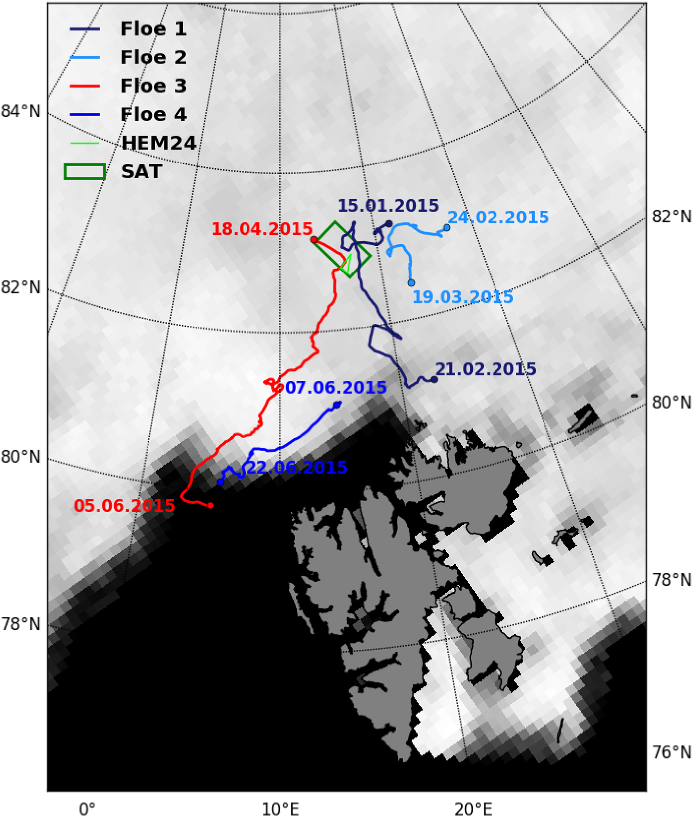 Fig. 1. Drifts of the ice stations (Floe 1–4) during the N-ICE2015 experiment. In this paper, we focus on data from the drift of Floe 3 (red). The green outline indicates the location of the ALOS-2 satellite scene from 23 April 2015 (SAT), and the light green line shows the co-located track of the helicopter-borne electromagnetic thickness measurements from 24 April 2015 (HEM24). The background is sea-ice concentration (black is 0%; white is 100% sea-ice concentration) from 23 April 2015 based on SSM/I data, calculated with ASI algorithm, provided by ICDC, University of Hamburg.