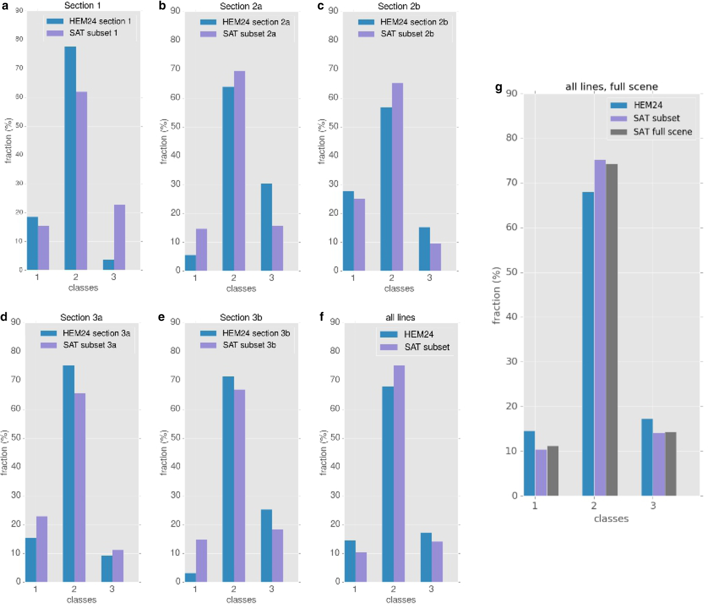 To compare HEM24 data with SAT data, we select the SAT pixels from a rectangular subset, underlying the individual HEM24 sections (SAT_sub; see Fig. 2d) and focus on the frequency of occurrence of the simplified classes by displaying them as PDFs or bar plots.