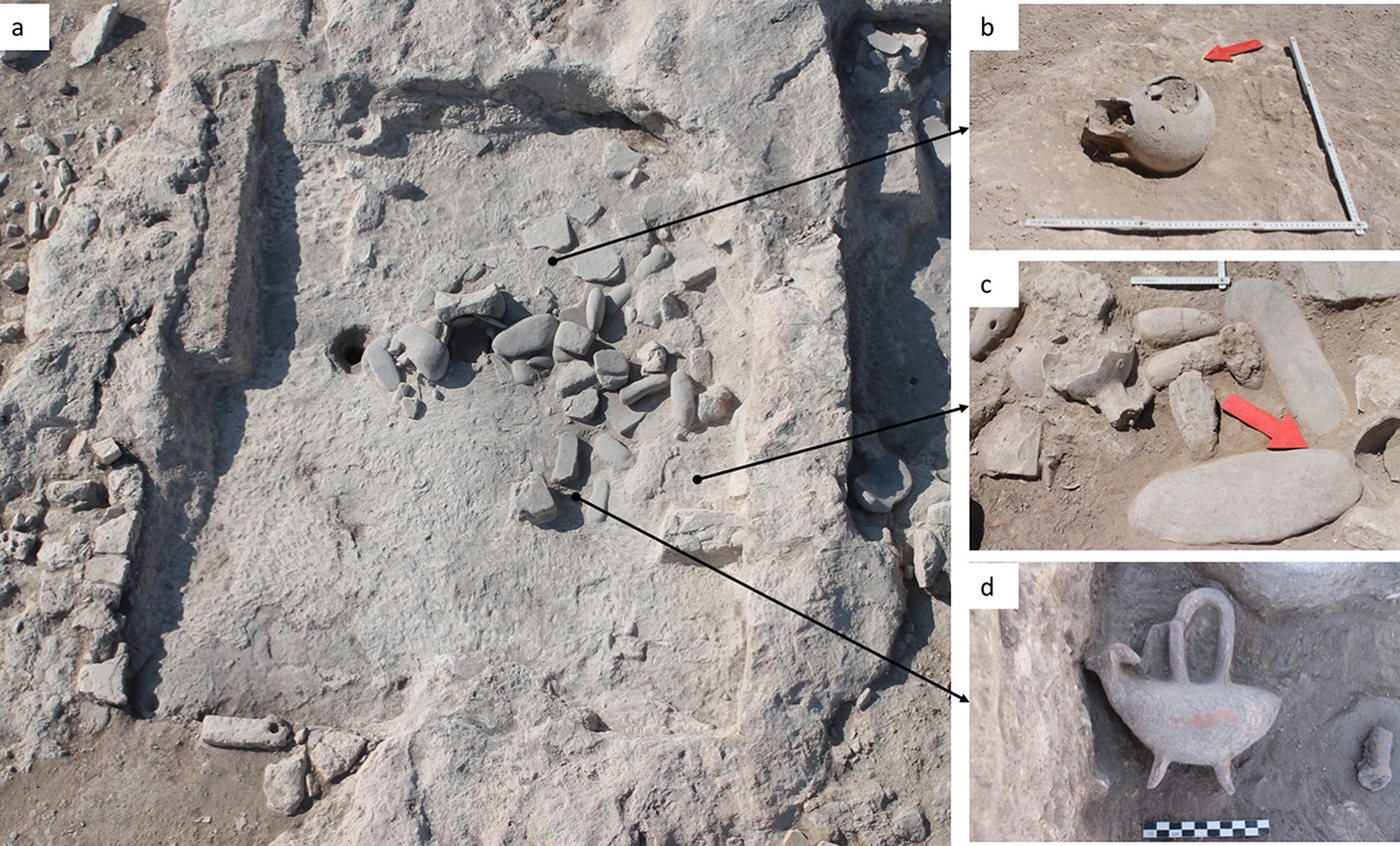 Figure 5. Workshop complex. Unit SA III: a) layer of stones intentionally deposited on the occupation surface; b–d) intact vessels and tools recovered from the occupation surface.