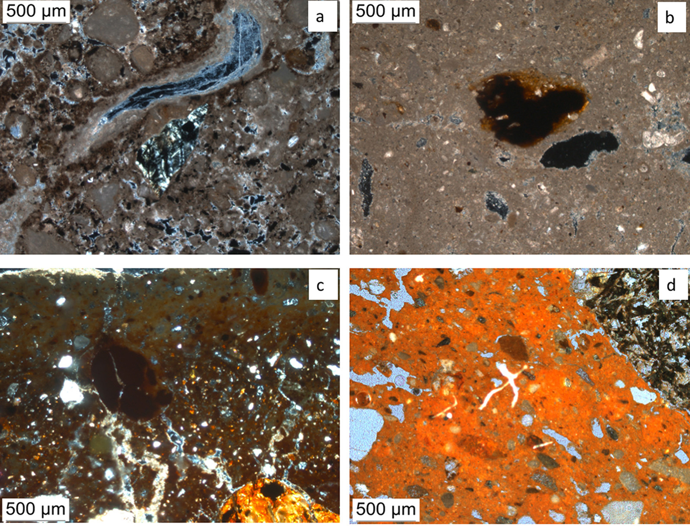 Figure 6. Photomicrographs showing: a) bioturbated deposits with burrows and reworking—area B; b) oxidation; c) vitrification; d) reddening identified in mud-brick layers—area A.