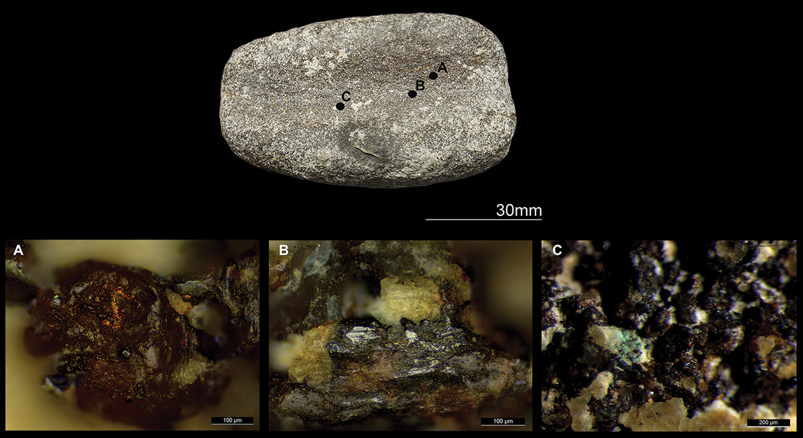 Piggott (Reference Piggott1962) compared the burial to European Mesolithic examples, where such costumed individuals are interpreted as shamans. He therefore argued that the individual was both a shaman and someone of considerable prestige (Piggott Reference Piggott1962: 96). As a result, the burial is often referred to as the Upton Lovell shaman, in part to distinguish it from the nearby, richly furnished ‘golden barrow’, Upton Lovell G2e. Piggott (Reference Piggott and Crittall1973) later compared the stone grave goods to metalworking tools from continental Europe, suggesting that the individual was a metalworker. Shell (Reference Shell2000: 271), highlighting that Thurnham (Reference Thurnham1870: 425f) had identified gold traces on one of the stone tools (STHEAD.2a), employed non-destructive, semi-quantitative X-ray fluorescence to analyse the traces, demonstrating that their elemental composition was similar to examples of Early Bronze Age gold. Shell concluded that the individual may have been a shaman, a metalworker, a goldworker, or possibly all three. Recent comparative typo-morphological analyses by Boutoille (Reference Boutoille and Brandherm2019) have confirmed that some of the tools were hammers used for metalworking and one was a touchstone for assessing gold quality. To date, therefore, the grave goods have played a key role in discussion of the identity of one of the individuals buried at Upton Lovell G2a. But can we do more with these materials?