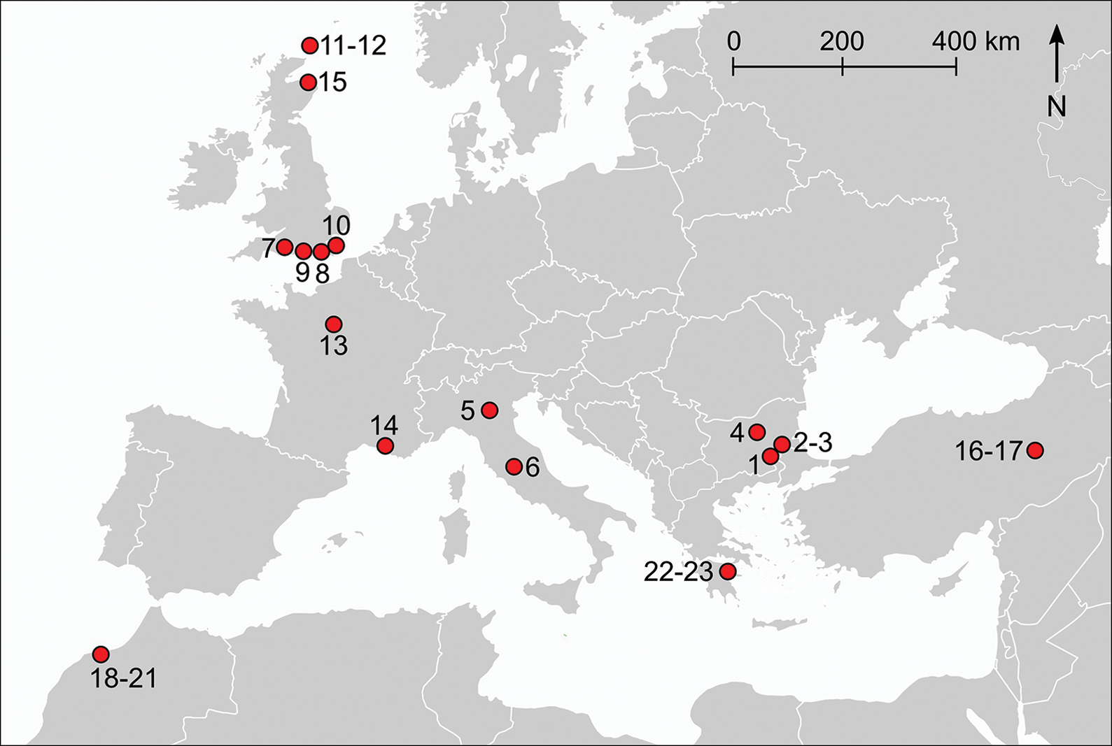 Twenty-three chicken bones were selected from 16 archaeological sites for direct radiocarbon dating (Figure 1; Table 1; for further details and references, see Table S1 in the online supplementary material (OSM)). The samples from Bulgaria were suggested to date to the Neolithic/Bronze Age, and those from Turkey and Greece were supposedly of Bronze Age date. For France, purportedly Bronze Age/Early Iron Age specimens were selected. We also targeted samples from Iron Age sites in Italy, Morocco and England, where claims have been made for the early presence of chickens. Lastly, we examined chicken bones from Iron Age sites in Scotland, although here the Iron Age extends much later, to AD 800.