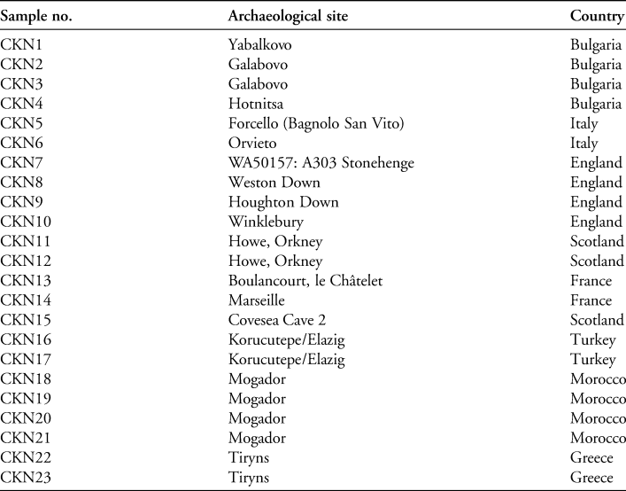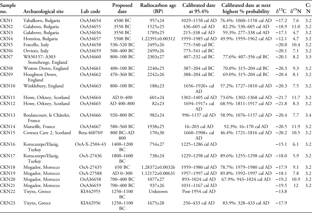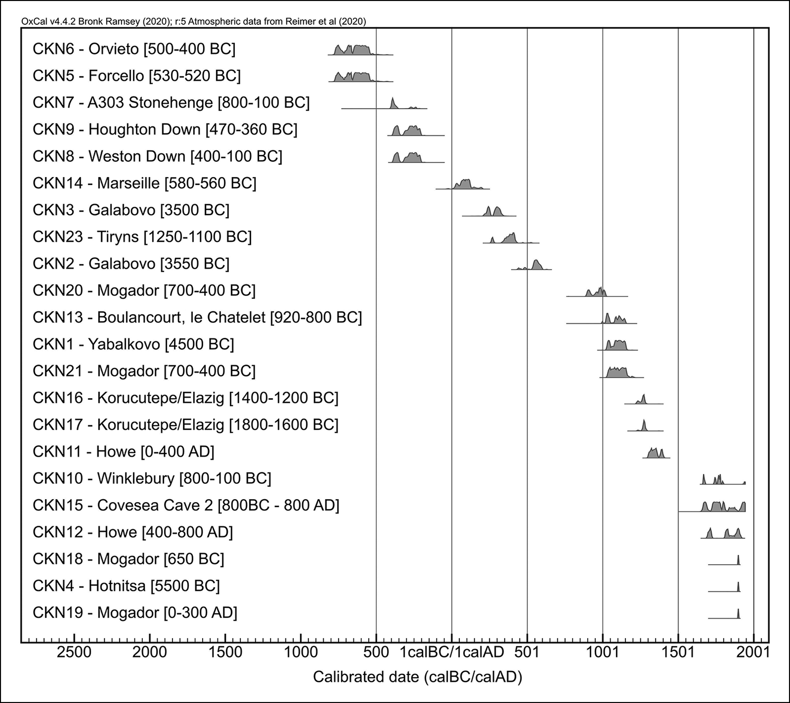 Both proposed Late Bronze Age specimens from Korucutepe in Turkey (CKN16 and CKN17) date to the thirteenth century AD, and CKN13 from Boulancourt, le Châtelet (France) is also medieval, rather than Bronze Age. Specimen CKN14 from Marseille (France), which was thought to be from a secure Iron Age context, is re-dated to the Roman period. At Covesea Cave 2 (Scotland), specimen CKN15 dates to the seventeenth to twentieth centuries AD, rather than Iron Age (800 BC–AD 800). Finally, the two chicken bones selected from Howe, Orkney, date to the fourteenth to fifteenth centuries AD (CKN11) and the seventeenth to twentieth centuries AD (CKN12), rather than their AD 200–800 context.