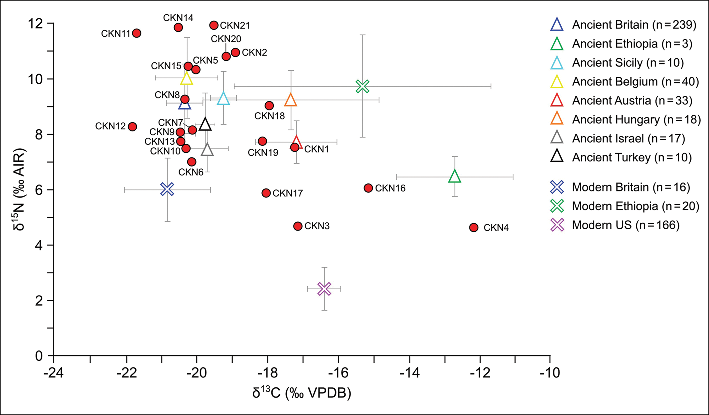 Differences between ancient and modern poultry production are exemplified by the chickens from Mogador. The two modern individuals (CKN18 and CKN19) had more positive δ13C values and more negative δ15N values compared with the two medieval-dated specimens (CKN20 and CKN21), whose isotope values plot within the distribution of other ancient chicken remains (Figure 4).