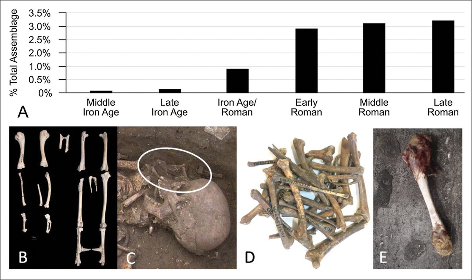 Figure 5. The association between (A) zooarchaeological representation (Skelton Reference Skelton2019) and depositional context. Earliest chickens were rare and often individually buried, as at (B) Middle Iron Age Houghton Down (CKN9). As chicken populations increased, they moved from being incorporated into human-chicken co-burial, as at (C) Roman Broughton (Yorkshire), to foodstuff, as at (D) Fishbourne Roman Palace. Today, chickens are so omnipresent that they are simply litter on the streets (E) (figure by S. Doherty).