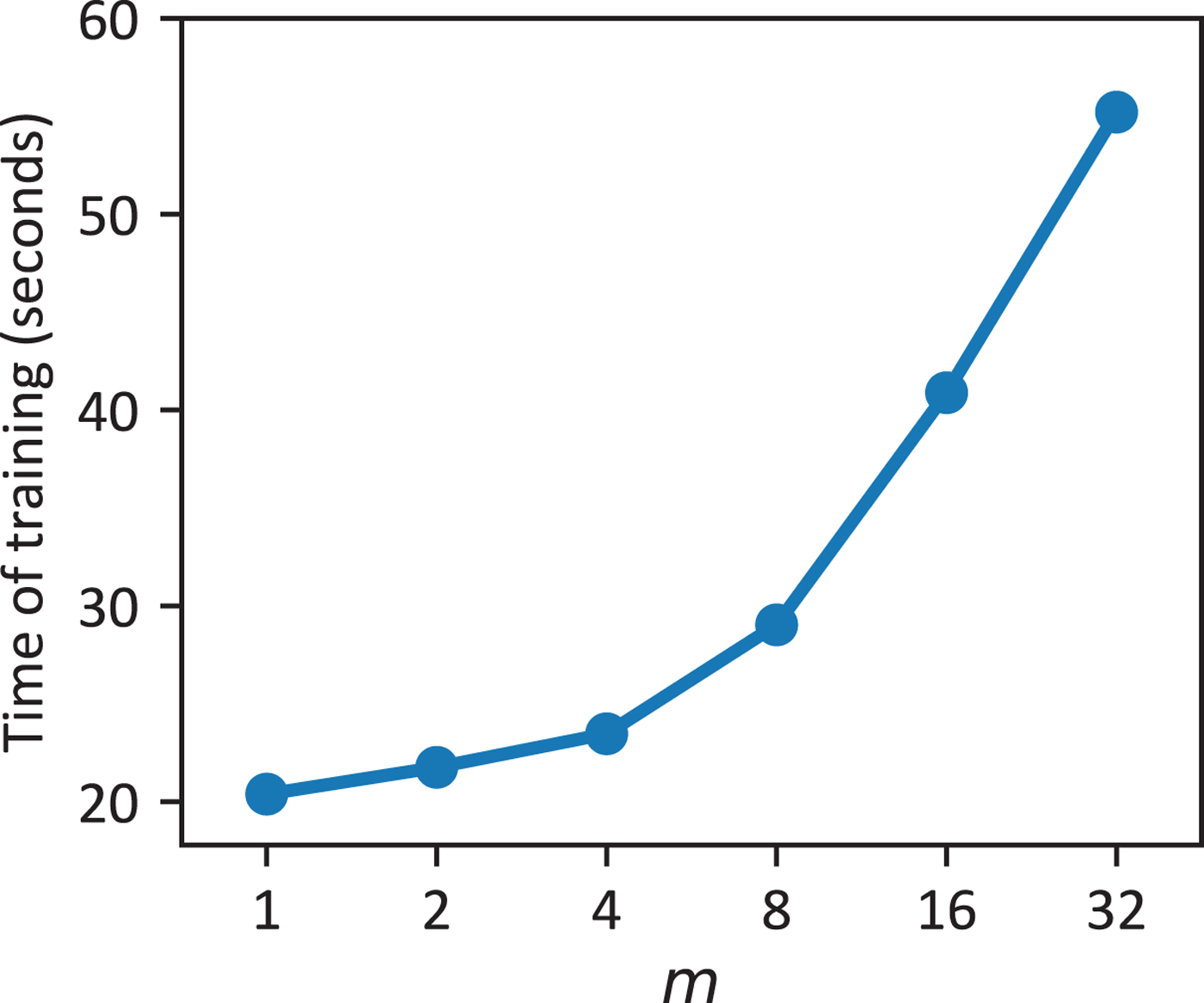 The two major parameters of our voice conversion system are the number of training sentences and the number of Gaussian components in the GMM model, i.e., m in equation (7). According to a survey of multiple users, we found that it is a good choice to build a transcription collection of 20 sentences with a duration around 4 or 5 s for the purpose of training. Though generally a larger training set can contribute to better performance, it may make the user get bored to read a lot of sentences and can also lead to an overlong training time. To determine the best option of m, we mainly need to balance the running time and the conversion performance. By testing various values of m, we summarize the training time with respect to each m in Fig. 15.