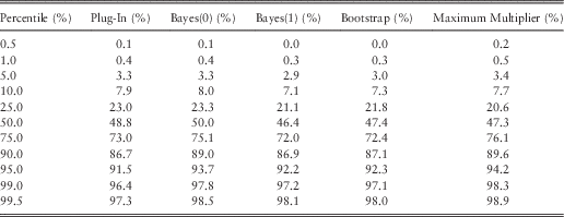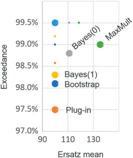 ∙ Methods described as incorporating parameter error, tend to perform better, if not perfectly, in percentile tests. However, the allowance for parameter uncertainty will tend to increase projected outcome variance, and thus fail bias tests.
