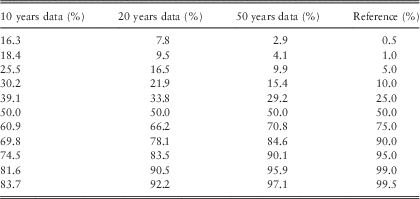 In our calculations for the AR1 model, we have used the simplest ersatz construction: another AR1 model, with parameters estimated by least squares and plugged in. We could consider Bayesian or bootstrap methods for capturing parameter uncertainty. Wilkie (Reference Wilkie1985) describes some investigations of mixture investment models where the underlying parameters are stochastic, reporting no material change in mean investment returns but an increase in standard deviations. Percentile tests are not provided, but it is to be hoped that these would show an improvement relative to the plug-in approach.
