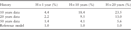 The figures in Table 11 should be read as follows. Let us focus on the horizon H=10 years. Under the reference model, if we want to forecast the log inflation index 10 years ahead, we can do so with a variance of 42.2%2, or equivalently, a s.d. of 42.2%.