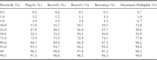 Such calibration errors are of course more severe when data are limited. Furthermore, the impact of a parameter error compounds over future time horizons; the further ahead we look, the greater the impact of uncertainty, especially in QMU and QA. We should not be surprised, therefore, that the percentile bias is smaller if the time horizon is shorter, or if the data sample are larger, as we saw in Table 14. This pattern is consistent with the Jensen effect we saw in the exponential example section 5.5.1.