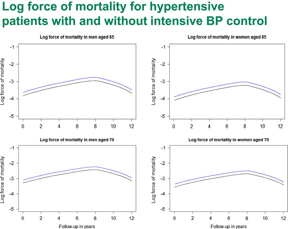 Figure 11 Log force of mortality for hypertensive patients with and without intensive Blood Pressure (BP) control