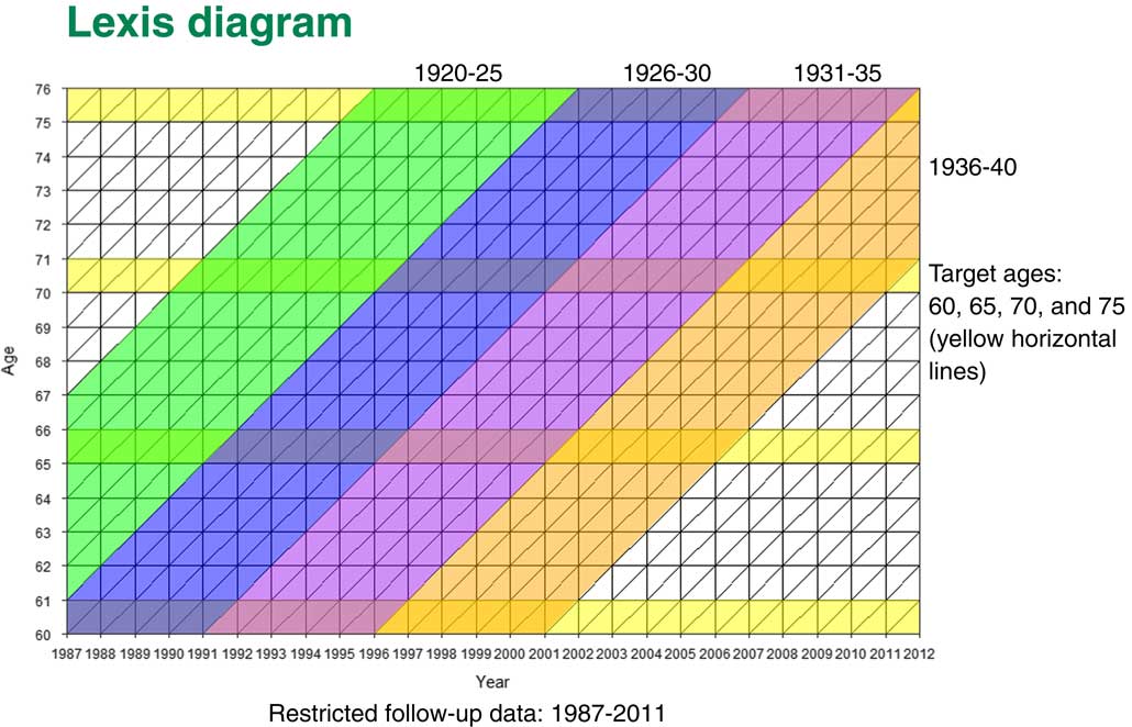 You can see that, for instance, that for people in the 60 years cohort, they would be born between 1927 and 1940. We will follow them up from 60 until they go through various other ages. People who come to the 70 year old cohort would be born between 1920 and 1940. Once more we would be following them up, but for a shorter period of time.