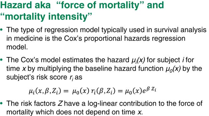 Now I will come to some statistical methods. What we are going to talk about here is the hazard of mortality. In statistics we call them hazards. In actuarial science they are usually called “force of mortality” or “mortality intensity”.