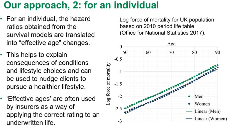 I will start from what to do for an individual. What we are going to do for an individual is that we are going to translate differences in hazards into changes from current age to effective age. That would help to explain consequences of various conditions or lifetime choices to, say, insurance clients, or patients in public health and basically to nudge clients to pursue a healthy lifestyle which is quite important in life-insurance or health-insurance.