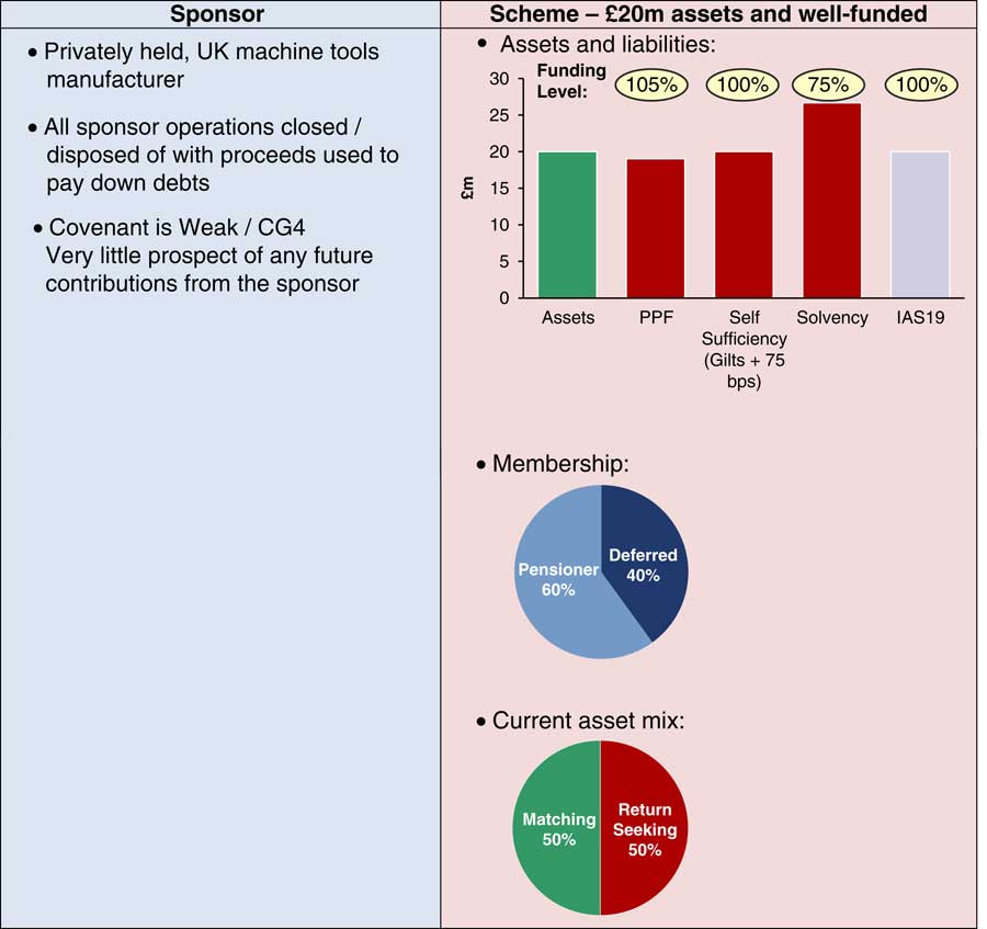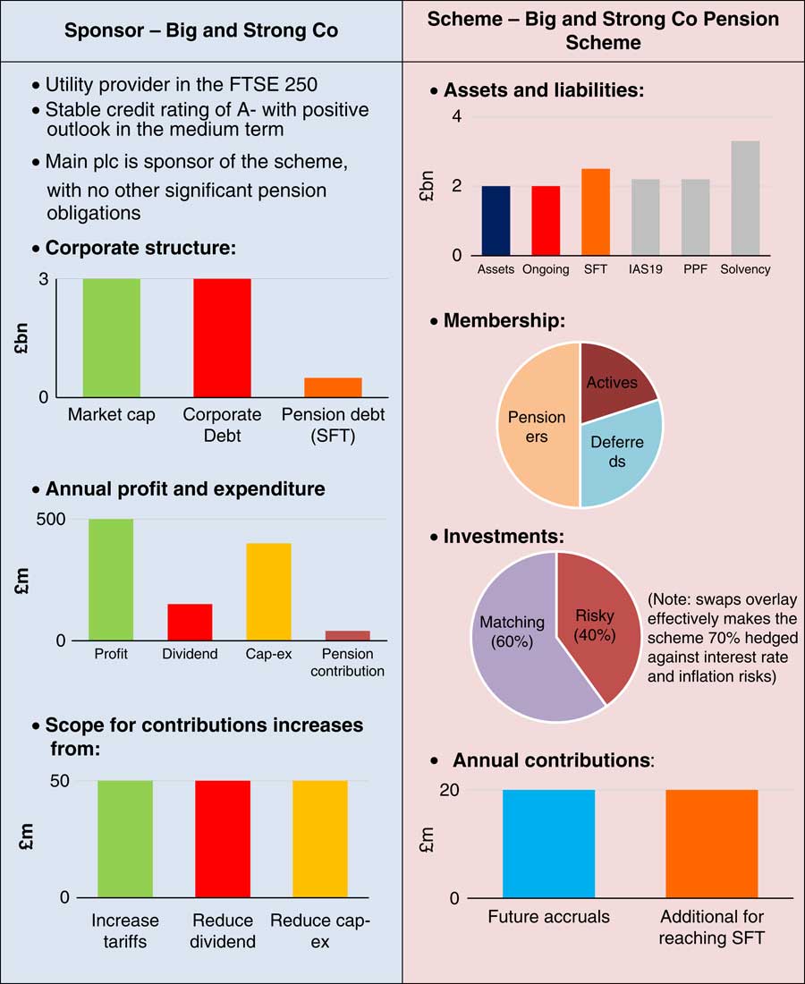 This first case study considers a pension scheme sponsored by an employer that can afford the contributions it is currently paying, but whose long-term future is in doubt. We see this as fairly typical in the pensions industry today. The case study focusses on the techniques actuaries can use to integrate covenant advice into funding and investment discussions, and deliberately simplifies other aspects.
