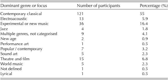 The composers worked in multiple genres including contemporary classical, electronic, orchestral, jazz, and film music. 71% of respondents held paid roles for 30 hours or more per week. Their weekly work in composition was reported as less than ten hours (35% of respondents) to 60 or more hours (1.3%). A demographic breakdown is included at Table 1 and the dominant genres reported by composers are shown at Table 2.