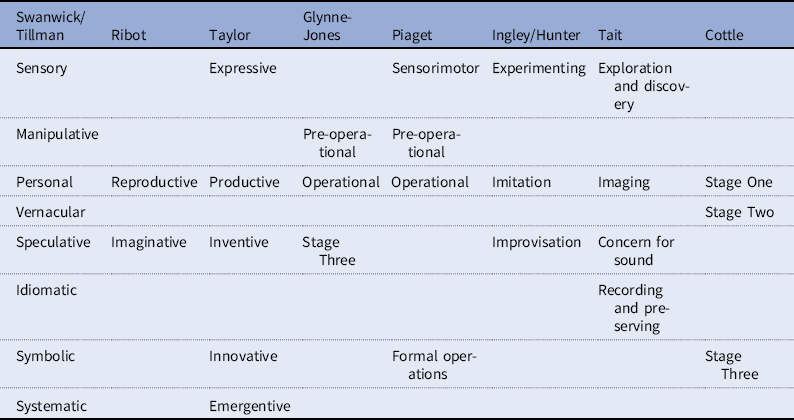 Reception to Boyce-Tillman’s research was varied, and it sparked multiple debates on the nature of musical interactions in children. Examples of these include the nature of playing by ear, which has been described as requiring the assimilation of sounds (Toplis, 1990); the significance of age-related developmental stages, where playing the violin in groups was found to replicate the findings of Swanwick and Tillman (Verney, Reference VERNEY1991); and creativity stages, which drew upon the patterns and organisations of sound presented in Swanwick and Tillman’s original paper (Levi, Reference LEVI1991). There were also critiques of the validity of Swanwick and Tillman’s approach. Lamont (Reference LAMONT1995) suggested that it lacked ‘predictive power’ (1995, p.10), indicating a retrospective rather than a representative model. It has also been considered to be culturally specific (Lehmann, Sloboda & Woody, Reference LEHMANN, SLOBODA and WOODY2007), thus limiting its value across differing contexts. There have been further suggestions that other forms of musical interface (such as music technology) may invalidate Boyce-Tillman’s account of ‘the development of musical ability’ (Cain, Reference CAIN2004, p. 218).
