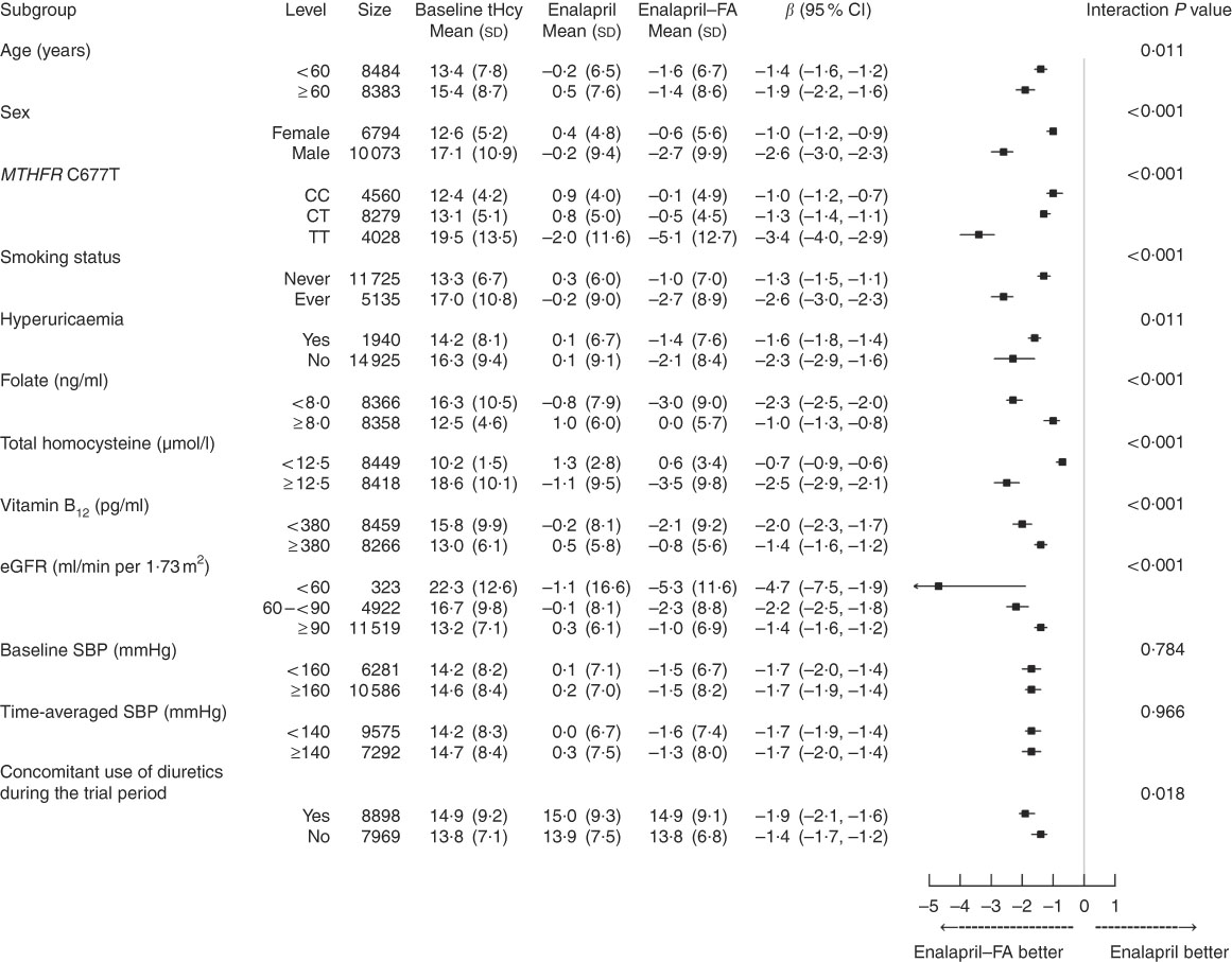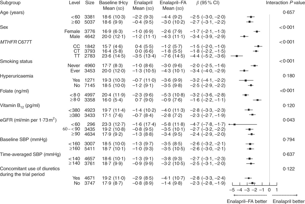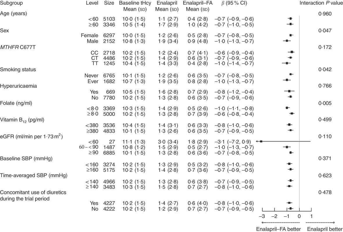 Our present analysis is the first study to comprehensively evaluate the effect modifiers of long-term daily 0·8-mg folic acid supplementation in lowering tHcy levels among adults with hypertension without stroke and MI. As expected, long-term daily 0·8-mg folic acid supplementation significantly lowered tHcy levels in this population. More importantly, male, MTHFR 677TT genotype, higher baseline tHcy levels, lower folate levels, eGFR <60 ml/min per 1·73 m2, ever smokers and concomitant use of diuretics were major modifiers for the efficacy of folic acid supplementation in lowering tHcy levels. All these factors should be taken into account in the identification of participants who may be most likely to benefit from tHcy-lowering therapy.