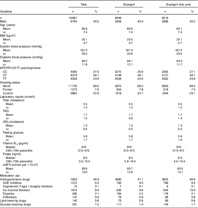 All baseline characteristics were comparable between the enalapril and enalapril–folic acid groups (Table 1). There were 1572 (9·3 %) participants undergoing treatment with ACEI at baseline.