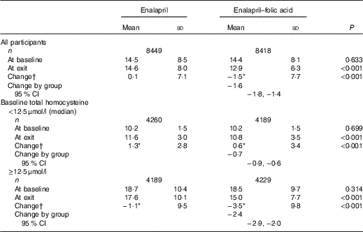 Mean baseline tHcy levels were comparable between the two groups (enalapril group, 14·5 (sd 8·5) μmol/l; enalapril–folic acid group, 14·4 (sd 8·1) μmol/l). After a median treatment period of 4·5 years, mean tHcy was 14·6 (sd 8·0) μmol/l in the enalapril group compared with 12·9 (sd 6·3) μmol/l in the enalapril–folic acid group (group difference: −1·6 μmol/l; 95 % CI −1·8, −1·4 μmol/l).