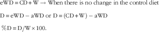 $$\eqalignno{ & {\rm eWD}\, {\equals}\, {\rm CD}{\plus}{\rm W}\to{\rm When}\;{\rm there}\;{\rm is}\;{\rm no}\;{\rm change}\;{\rm in}\;{\rm the}\;{\rm control}\;{\rm diet} \cr & {\rm D}\, {\equals}\, {\rm eWD}-{\rm aWD}\;{\rm or}\;{\rm D}\, {\equals}\, \left( {{\rm CD}{\plus}{\rm W}} \right)-{\rm aWD} \cr & {{\,\%\,{\rm D}\, {\equals}\, {\rm D}} \mathord{\left/ {\vphantom {{\,\%\,{\rm D}\, {\equals}\, {\rm D}} {{\rm W}{\times}100}}} \right. \kern-\nulldelimiterspace} {{\rm W}{\times}100}}. $$