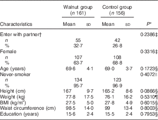 Table 1 shows the baseline characteristics of 317 participants (63·4 % female; 50·8 % walnut group) who had sufficient data for analysis. The average age of the participants was 69·6 years in the walnut group and 69·1 years in the control group. Both treatment groups were comparable regarding height, body weight, body composition parameters, sex and ethnicity. We excluded from analysis thirty-nine participants who dropped out of the study in the first few months and for whom dietary data were unavailable. There were twenty dropouts in the walnut group and nineteen in the control. The dropouts did not differ significantly from completers on age, sex, ethnicity and baseline BMI.