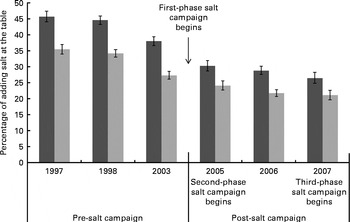 The present study indicates that in England, over the period 1997–2007, there was a steady decline in salt use at the table, and importantly that the reduction in salt use at the table was significantly greater after the introduction of the FSA's salt reduction campaign in 2004. Salt use at the table accounts for 15–20 % of total salt intake, and this is the first time that the impact of the FSA salt reduction campaign on salt use at the table has been quantified. The present analysis also suggests that adding salt at the table was more common in males, those of white ethnicity, those living in the north of England and those from lower total household income groups.
