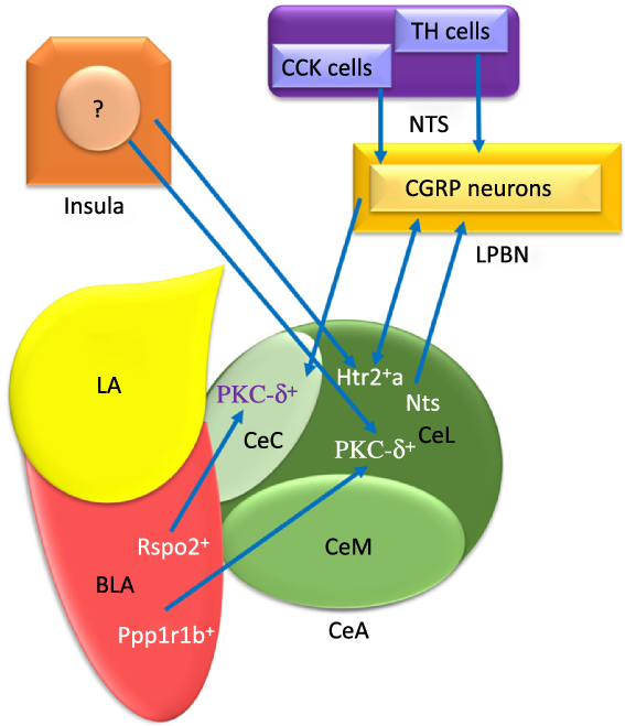 The NTS terminates food intake with glutamatergic input projections from the tyrosine hydroxylase and cholecystokinin cells to the PKC-δ + neurons of both CeL and CeC; also, the NTS activates CGRP of the LPBN neurons(Reference Douglass8,Reference Lu, Chen and Wei14,Reference Ye and Veinante26,Reference Hardaway, Halladay and Mazzone41,Reference Andermann and Lowell47–Reference Carter, Soden and Zweifel49) . Moreover, the CGRP receptors in PKC-δ + neurons are probably the aim of CGRP neurons in the LPBN(Reference Campos, Bowen and Schwartz48,Reference Han, Soleiman and Soden50) . However, Wang et al. (2019) indicated that the CGRP neurons in the LPBN suppress food consumption via excitatory projection to Htr2a+ neurons in the CeA(Reference Wang, Kim and Schmit45).