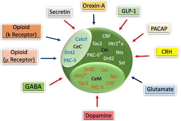 The central amygdala and different receptors as well as neurotransmitters/neuropeptides
