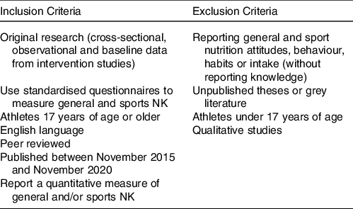 There have been a number of reviews within this space. Spronk et al.’s 2014 review examined NK and dietary intake of community populations and athletes, with a larger focus on community population data(Reference Spronk, Kullen and Burdon23). Trakman et al.’s 2016 review examined the NK of athletes and coaches emphasising the knowledge gaps within these populations, without examining the dietary intake of athletes in relation to dietary intake(Reference Trakman, Forsyth and Devlin21). A recent narrative review examines NK of USA collegiate athletes and how sports dietitians impact NK and behaviours in those athletes, excluding athletes outside of USA collegiate sport(Reference Riviere, Leach and Mann24). Heaney et al.’s 2011 review combined NK and dietary intake in athletes; however, there has been a wide variety of research published between 2011 and 2020 requiring evaluation in this space(Reference Heaney, O’Connor and Michael10). It can be seen from the evidence here that an updated review of this area was required which examined the relationship between NK and dietary intake in athletes specifically.