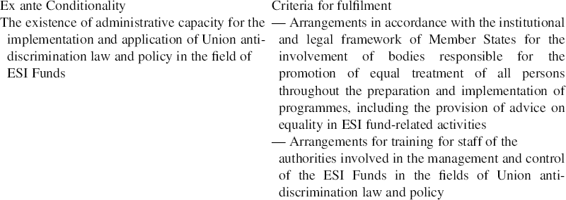 58 See for instance the example of non-discrimination conditionality, Regulation (EU) 1303/2013, Annex XI, Part 2, point 1, see note 40 above: