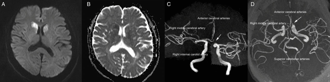 Figure 1: (A) Diffusion-weighted imaging conducted 2 days after symptoms onset revealed a high-intensity signal in the bilateral head of the caudate nucleus. (B) The apparent diffusion coefficient values within the bilateral head of the caudate nucleus were low. (C and D) Magnetic resonance angiography revealed variations in the anterior cerebral arteries (arrows).