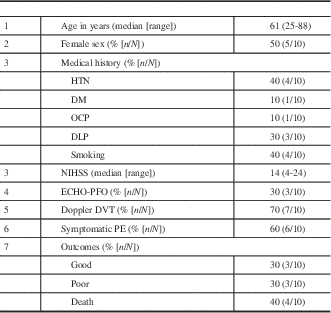 HTN=hypertension; DM=diabetes mellitus; OCP=oral contraceptive pills; DLP=dyslipidemia; NIHSS=National Institutes of Health Stroke Scale range from 0 to 42, with higher scores indicating more severe neurologic deficits; ECHO-PFO=echocardiogram positive for patent foramen ovale; DVT=deep vein thrombosis; PE=pulmonary embolism.