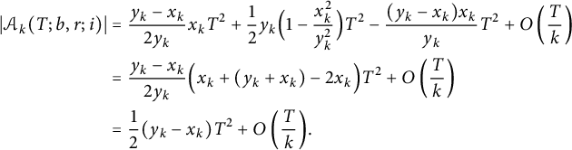 $$ \begin{align} \notag \mathcal{A}_k(T) = \mathcal{A}_k(T; b, r; i) &= \Bigl\{ (n, m) \in \mathbb{N}^2 \cap [1, T]^2 \colon \frac nm \in \Bigl[ \frac{k b + r}{b^i}, \frac{k b + r + 1}{b^i}\Bigr) \Bigr\} \\ &= \bigl\{ (n, m) \in \mathbb{N}^2 \cap [1, T]^2 \colon m \in \bigl( n x_k, n y_k \bigr] \bigr\} \end{align} $$