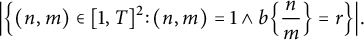 $$ \begin{align*} \vert\{ (n, m) \in [1, T]^2 &\colon \phi(n / m) = r \}\vert \\ &= \sum_{d \le T} \vert\{ (n, m) \in [1, T]^2 \colon (n, m) = d \land \phi(n / m) = r \}\vert \\ &= \sum_{d \le T} \vert\{ (n, m) \in [1, T / d]^2 \colon (n, m) = 1 \land \phi(n / m) = r \}\vert. \end{align*} $$