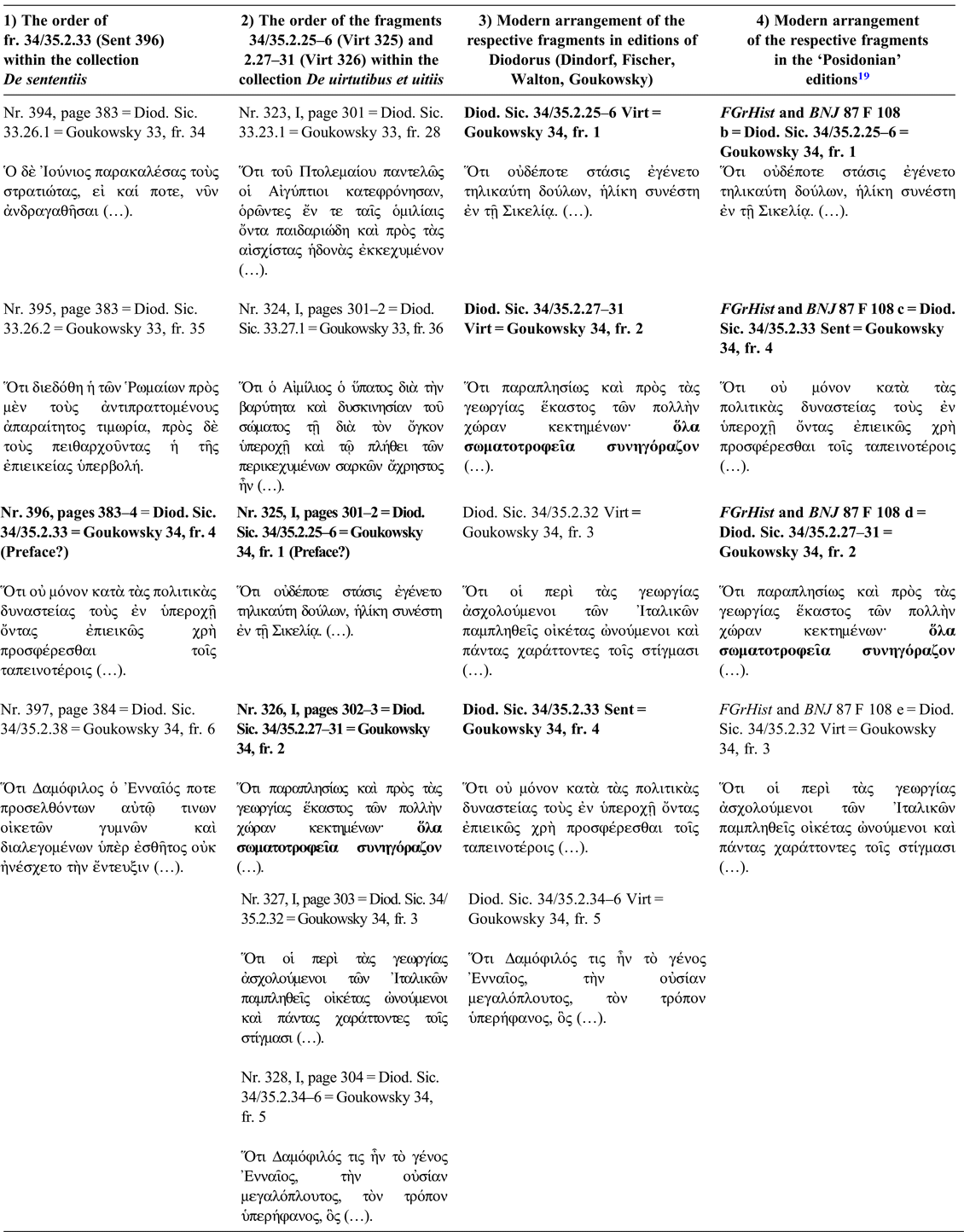 The occurrence of a preface from Diodorus’ Bibliothêkê within the collections of Constantinian excerpts would not be surprising, since some proems from the lost books of Diodorus have been transmitted in that way (21.1.4a; 25.1.1, 2.1; 26.1.1–3; 32.2.1, 4.1–5; 37.1.1–6, 29.2–5 and 30.1–2 from the preface to Book 38?). However, the main precondition for considering any excerpts a part of a Diodoran preface is their appropriate position within the Constantinian collection. That means that they must occupy a position corresponding to the beginning of a book in Diodorus. In our case, given that the two fragments derive from two different collections, they need to precede all other excerpts from Book 34 respectively. Table 1 (columns 1 and 2) illustrates the position of the two fragments within the respective Constantinian collection.
