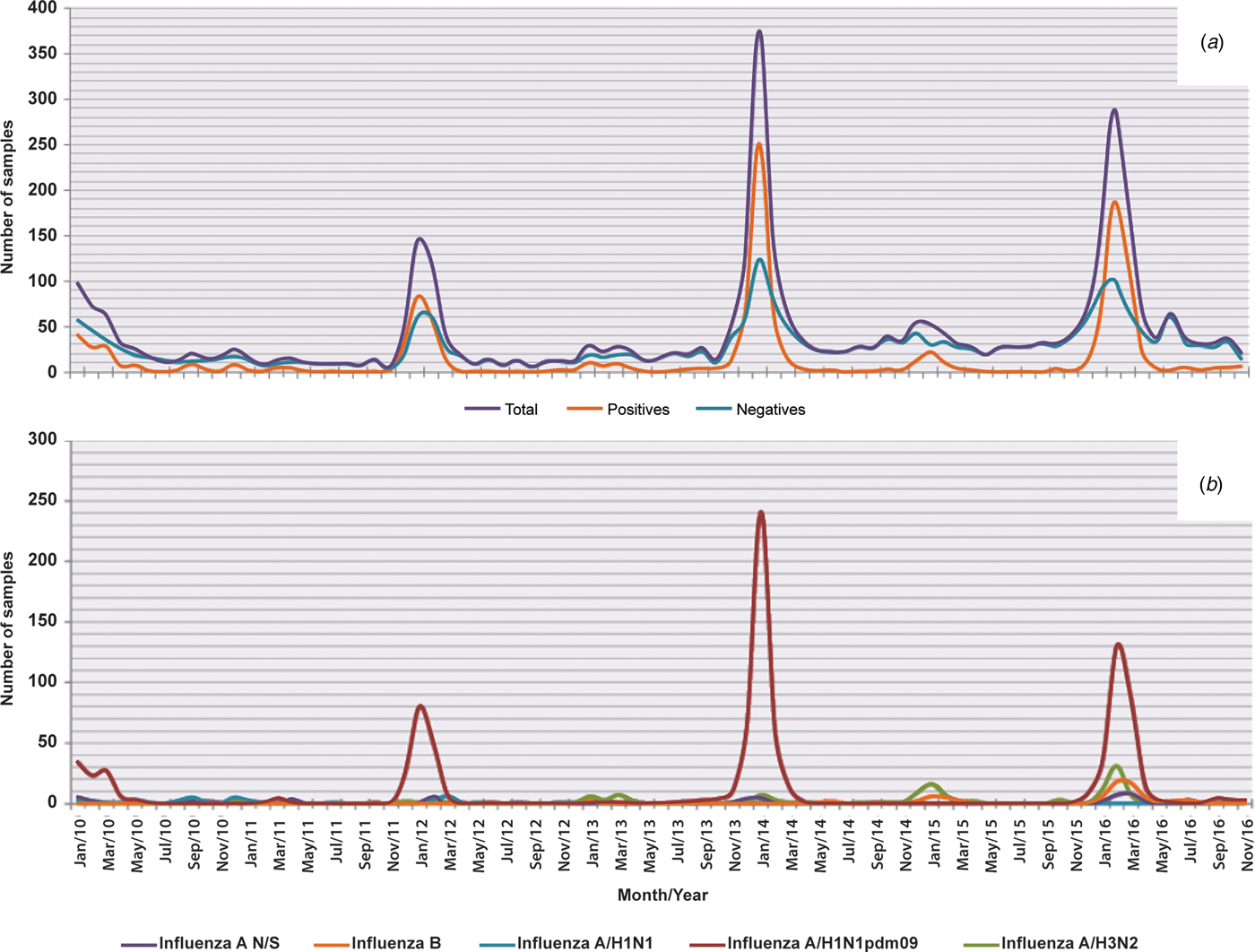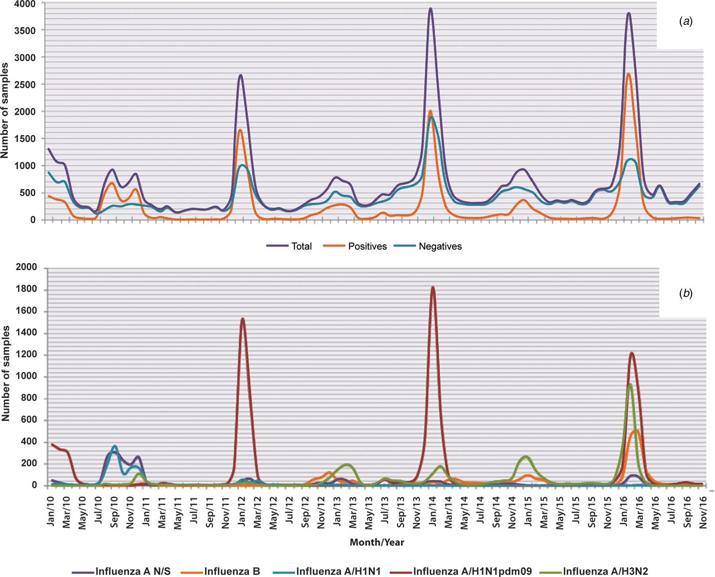 Fig. 2. Seasonality of influenza and negative cases from 2010 to 2016. The figure shows the monthly circulation of influenza, the negative cases and each subtype identified during the study period (2010–2016). (a) Total, positive and negative cases of influenza and (b) influenza subtypes.