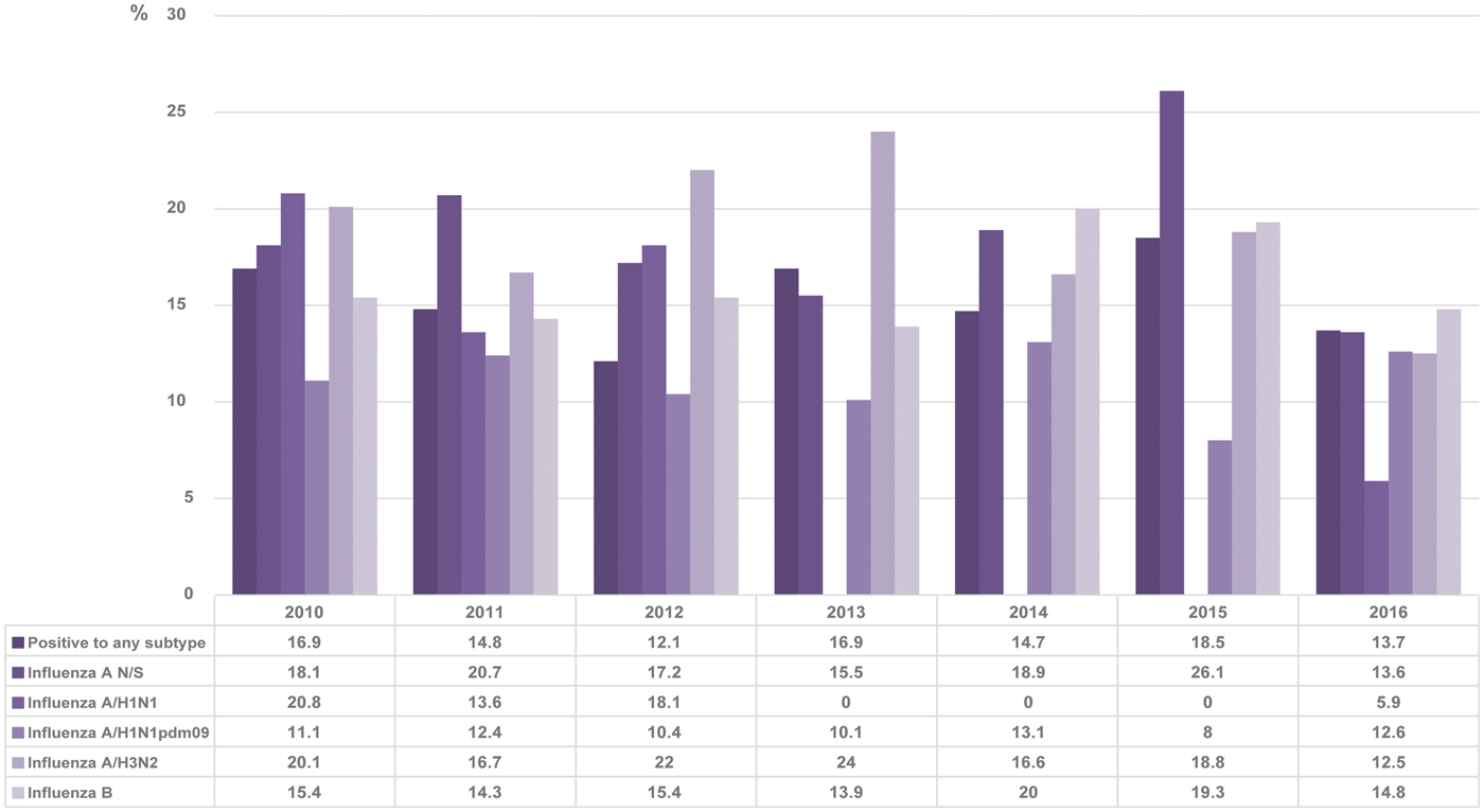 Fig. 1. Influenza positivity from 2010 to 2016. The figure shows the positivity observed and the influenza subtypes identified during the study period.