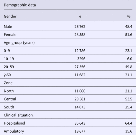 The study included data generated from 55 320 samples. The population was composed of 48.4% males and 51.6% females. The patient's ages ranged from 0 to 108 years. The population was divided into four age groups as follows: 0–9 years, 10–19 years, 20–59 years and ⩾60 years. The age group with the highest number of cases based on the case definitions during the period covered by the study was the 20–59 year olds with 49.8%, followed by the 0–9 year olds, ⩾60 year olds and lastly the 10–19 year olds, with rates of 23.1, 21.1 and 6.0%, respectively. With regards to the case severity, the percentage of hospitalisations (64.4%) surpassed the outpatient cases (35.6%) (Table 1).