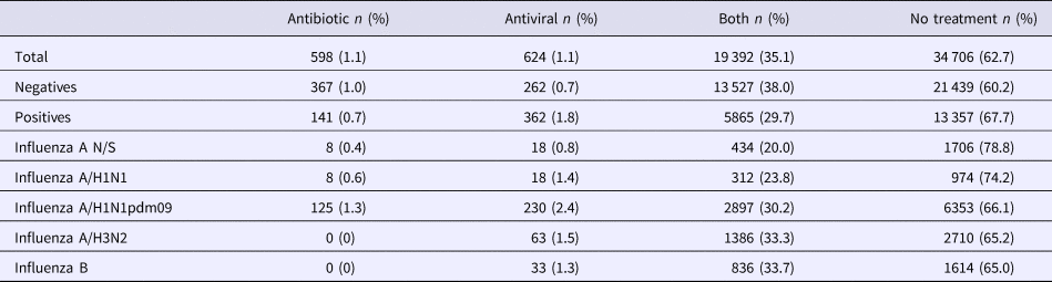Notably, the percentage of negative cases treated with oseltamivir exceeded that of the positive cases, and 30.4% of the patients infected with influenza were treated with antibiotics. This practice has also been reported in other studies, where high percentages of the indiscriminate use of antibiotics have been reported during the treatment of respiratory infections of viral origin [Reference Cantrell, Young and Martin39, Reference Remolina40].